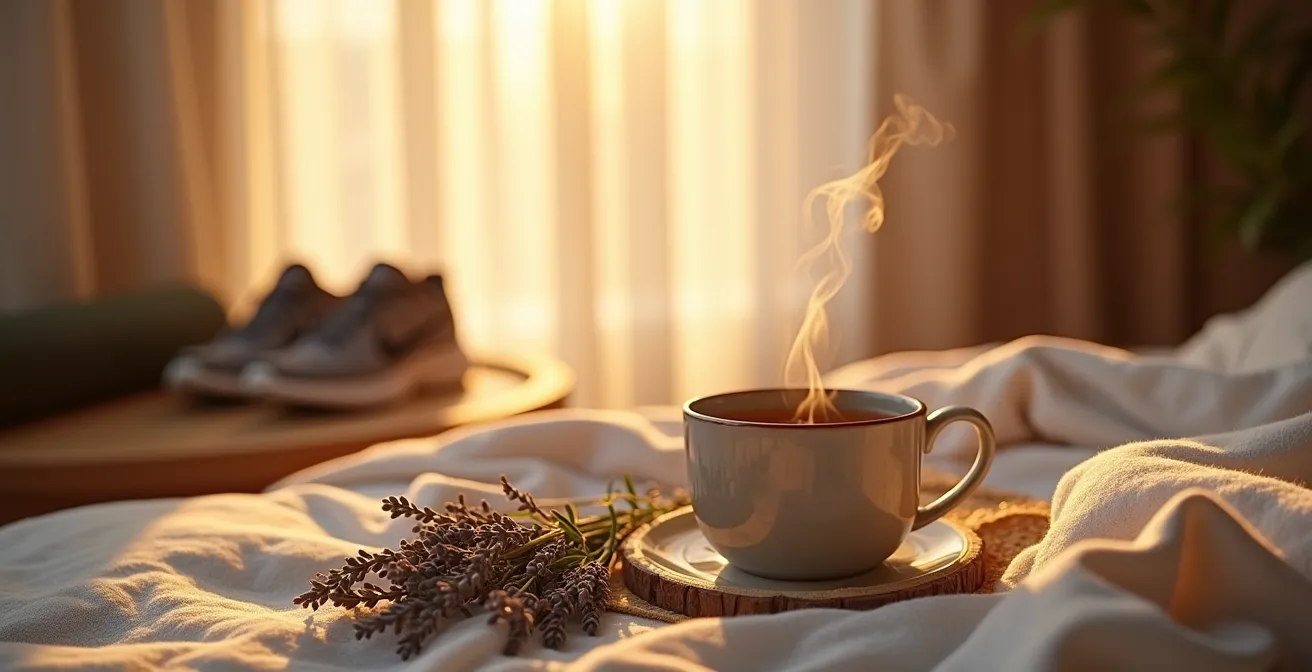 Le principal ennemi du sommeil de l’athlète n’est pas toujours le surentraînement, mais souvent une routine du soir inadaptée. Le scrolling infini sur un smartphone est particulièrement néfaste : la lumière bleue inhibe la production de mélatonine, et le flux d’informations maintient le cerveau en état d’alerte. Remplacer cette habitude passive et nuisible par un rituel actif et bénéfique est la première étape de votre ingénierie nocturne. La préparation d’une tisane au chanvre n’est pas une simple tâche, c’est un protocole de descente.